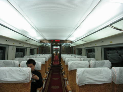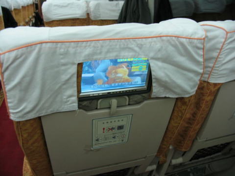 一等座車 車内 画像提供 伊藤様 一等座車は、座席の背面に液晶モニターが取り付けられ、DVDを鑑賞できるのがウリだが、実際に乗った方の話ではまともに機能していない模様。