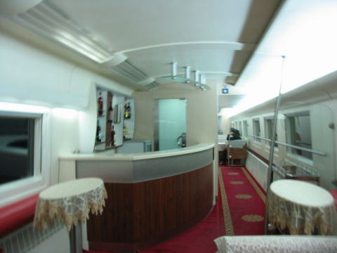 短距離専用列車にもかかわらず一両をまるまる割いて供食スペースにあてるとは豪勢だが、実際には厨房設備はなく簡単な飲み物やお菓子を提供するのみで、従業員休憩スペースとして使用されている。