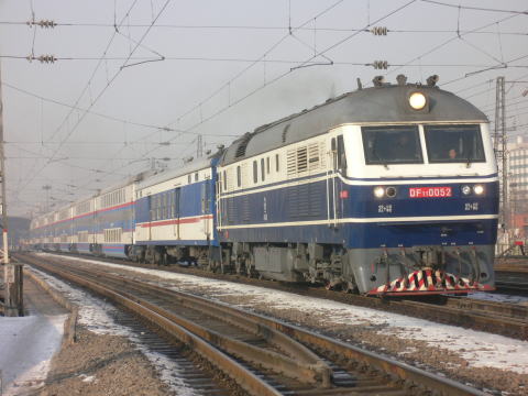 東風11型データ 製造初年 1992年 製造所 戚墅堰機車車輌廠 軸配置 C-C 動力伝達方式 電気式 駆動方式 中空軸平行カルダン 全長 21250mm 自重 135t ディーゼル機関及び機関出力 16V280ZJA 3610kw/4910PS 電動機総出力 3040 kw 最高速度 170km/h 北京駅を出発して東便門橋を渡る今はなき瀋陽行き特快列車。