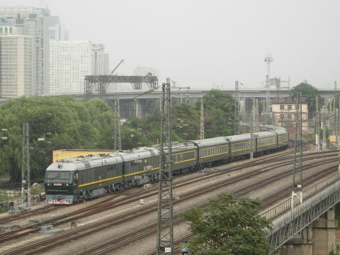 東風11Z型データ 製造初年 2002年 製造所 戚墅堰機車車輌廠 軸配置 C-C 動力伝達方式 電気式 駆動方式 中空軸平行カルダン 全長 21250mm×2 自重 138t×2 ディーゼル機関及び機関出力 16V280ZJA 3610kw/4910PS×2 電動機総出力 3040 kw×2 最高速度 170km/h 専運列車を牽引するDF11Z。ダークグリーンで統一された美しい編成美を見せてくれる。