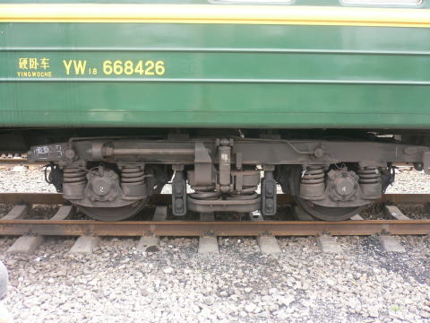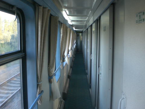 写真の硬臥車YW18型は、旧共産圏標準型車両のうち定員36名のMECT36(厳密には形式名ではない)と同型車。硬臥とはいうものの、二段ベッド式・4人部屋のコンパートメントが9室並ぶ車内構成で、このタイプの車両は俗に「硬臥包」と呼ばれています。そのため定員は36名と、軟臥なみの少なさです。