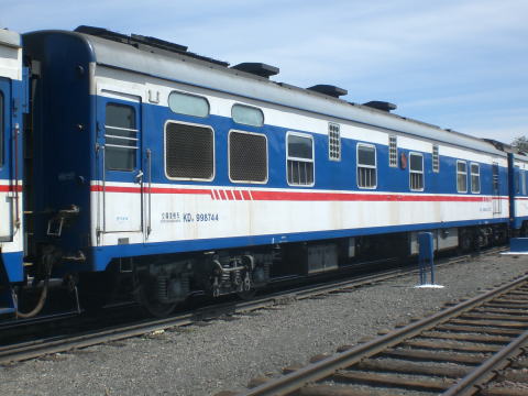 餐車 CA18 892004 北京機務段 18系餐車CA18。ドイツ製の寝台車とは異なり、こちらは中国の南京浦鎮車両廠製。25系客車に準じたリブなしのすっきりした車体を持ち、車体長も25系と同じく全長25m級の大型車体になりました。主に非空調車輌で編成される国際列車の中で唯一空調設備を有している車輌で、床下に発電機と発電用ディーゼルエンジンを装備しています。