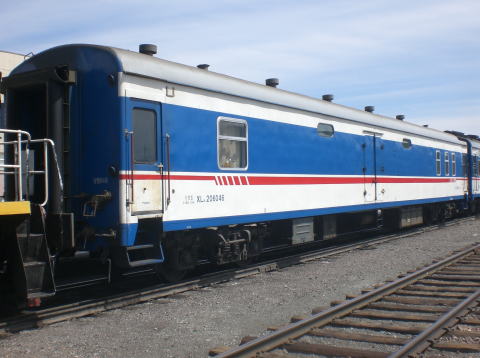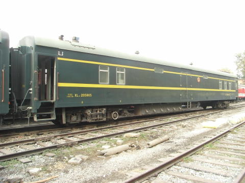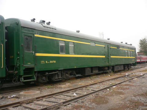 行李車 XL18 205905 北京機務段 リブのないすっきりした車体の18系行李車で、こちらも餐車同様、輸入車ではなく国産車です。18A系の行李車YW18Aがベースと思われますが、床下に並ぶ特徴的な形態の蓄電池など床下機器は国際列車仕様となっています。