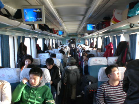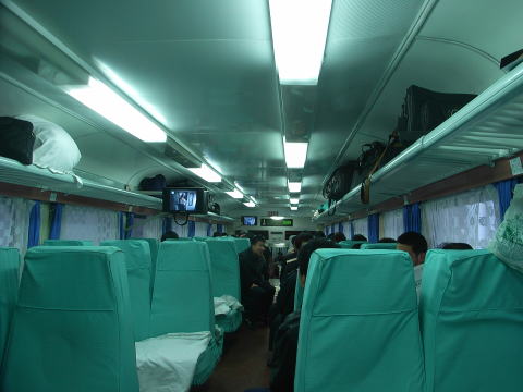 座席が通路を挟んで二人-二人がけになったこと以外は、シートの質、シートピッチともに硬座車と何の変わりもありません。軟座車 RZ25K 車内