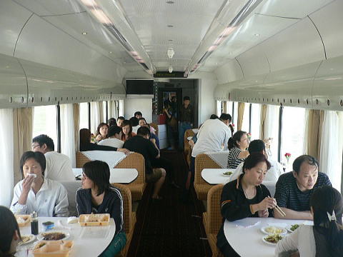 チベット客車の食堂車車内。夜発朝着が多い25T系列の中でラサ行き列車は例外的に長距離を走ります。