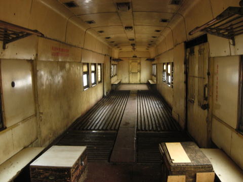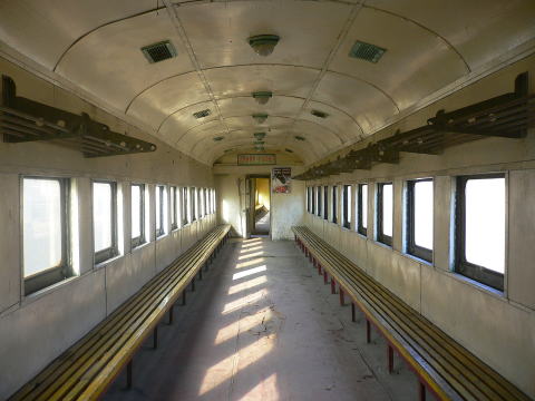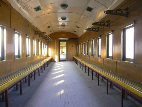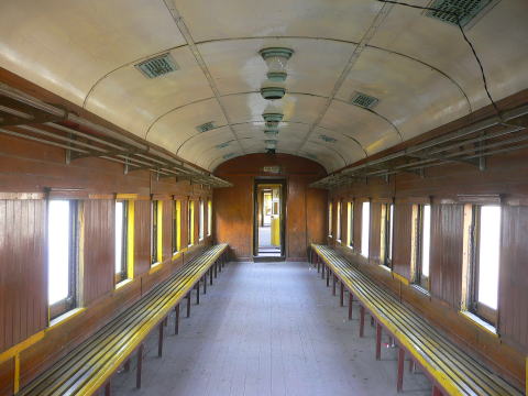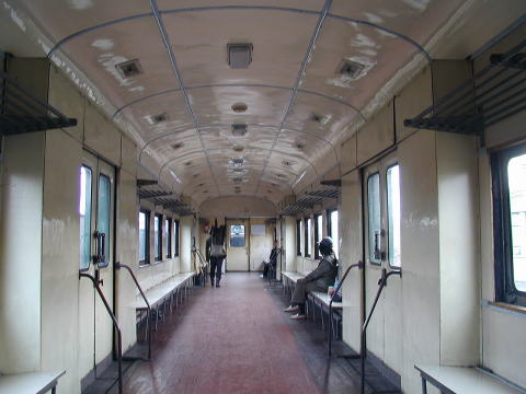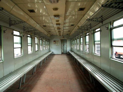 車内は全ての寝台が撤去され、その代わりにベンチが取り付けられています。