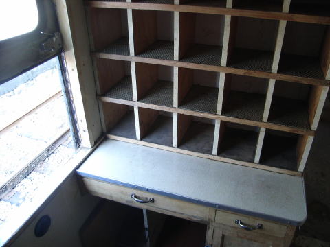 郵便室部分にあった郵便の区分棚。現在は機能していません。 郵便荷物合造車 XU30 車内