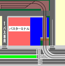 円山公園バスターミナル。市電東西線の円山公園駅は、このバスターミナルの位置にあると想定しています。大通を走ってきた電車は丁度写真の矢印のように右にカーブして専用軌道に入り、丁度バスが停車しているあたりにあるプラットホームにすべりこみます。