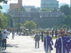 電車は石山通アンダーパス直上にある「裁判所前」電停に到着。国道230号線、通称石山通は定山渓、中山峠を越えて札幌と道南を結ぶ幹線道路だけあって、交通量は非常に多く、朝夕の道路渋滞の名所である。東西線開業当初、電車はここで石山通と平面交差していたため、必ずといっていいほど信号待ちを強いられスピードアップの障害になっていたのだが、平成元年に念願の石山通アンダーパスが完成。電車のスピードアップが達成されるとともに、石山通で分断されていた「大通公園やすらぎの広場」も一体化された。「裁判所前」電停付近には、電停名どおり高等裁判所、簡易裁判所、家庭裁判所など司法関係の施設が集中しているほか、道庁の第三合同庁舎もあり、ここでの乗降客は多い。